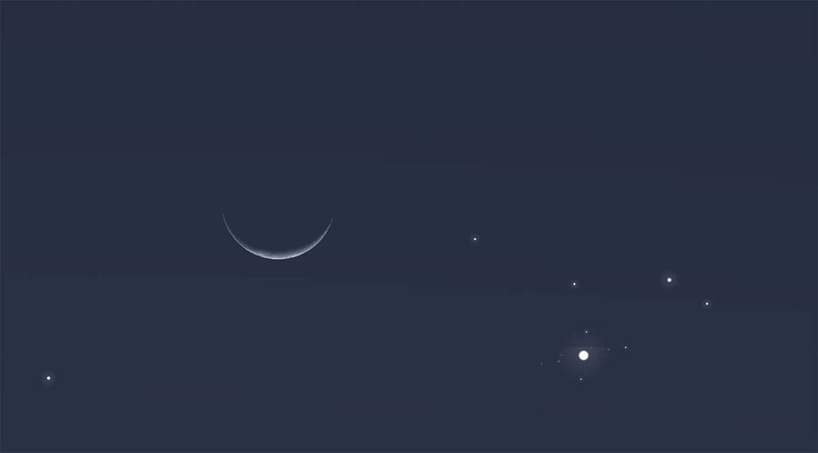 قبل ساعات قليلة من شروق الشمس، ستظهر قطعة رفيعة من الهلال المتضائل في الأفق الشمالية الشرقية ويتمركز بجانبه على جهة اليسار “نجمة” بيضاء فضية باهرة تتألق بتوهج ثابت وفي الواقع هذه ليست نجمة وإنما كوكب الزهرة المتألق الذي سيكون لامعا بقوة -4.2 (أكثر سطوعًا بثلاثة عشر مرة من سيريوس ، النجم الأكثر سطوعًا) على بعد 88.8 مليون ميل (142.8 مليون كيلومتر) من الأرض.
