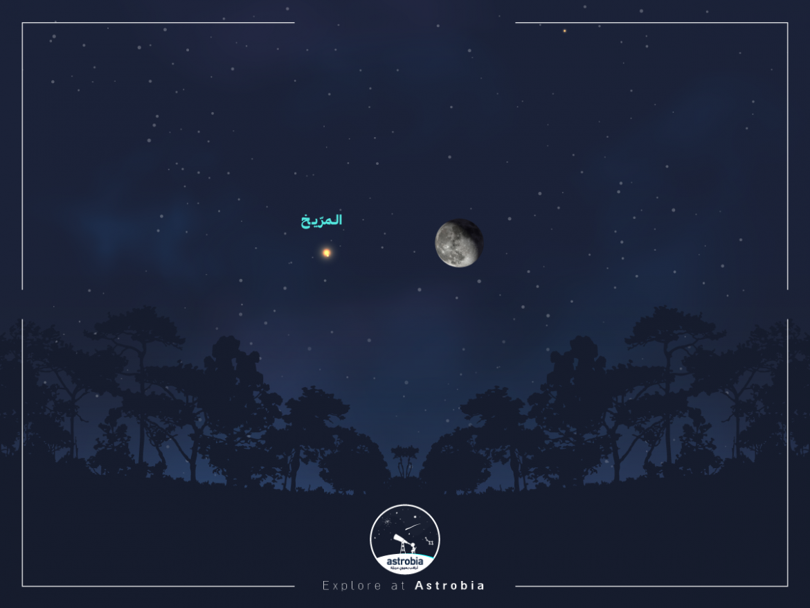سيتمركز القمر الأحدب أسفل يمين الكوكب الأحمر اللامع عند بزوغه في الشرق قبل منتصف الليل مباشرة. سيجتمع هذان الزوجان كاثنين معشوقين عابرين طرق السماء مع بعضهما البعض وخلال هذه الفترة ستقوم حركة مدار القمر الشرقي بتقريبه شيئًا فشيئًا من المريخ وفي نفس الوقت سيقوم المريخ أيضًا بالاقتراب من الجهة اليمنى للقمر الأحدب من خلال الدوران اليومي للسماء.