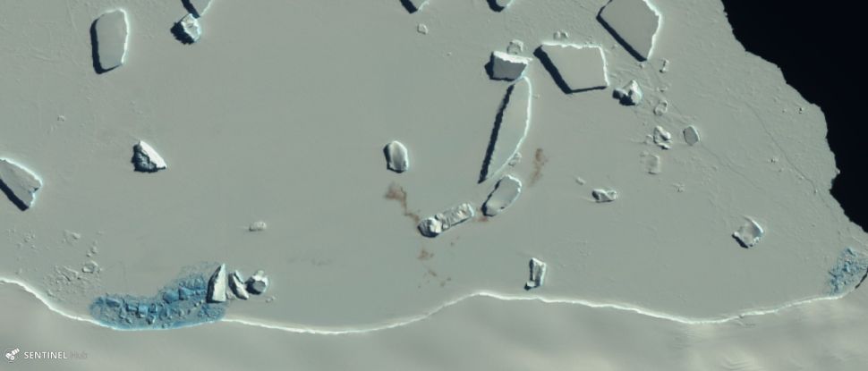 كشفت لطخات الفضلات البنية في يمين منتصف هذه الصورة الملتقطة عام 2016 بواسطة القمر الصناعي سنتينيل-2 التابع لوكالة الفضاء الأوروبية للأراضي الجليدية التابعة لأقصى جنوب قارة أنتارتيكا عن تواجد مستعمرات للبطريق الإمبراطور.