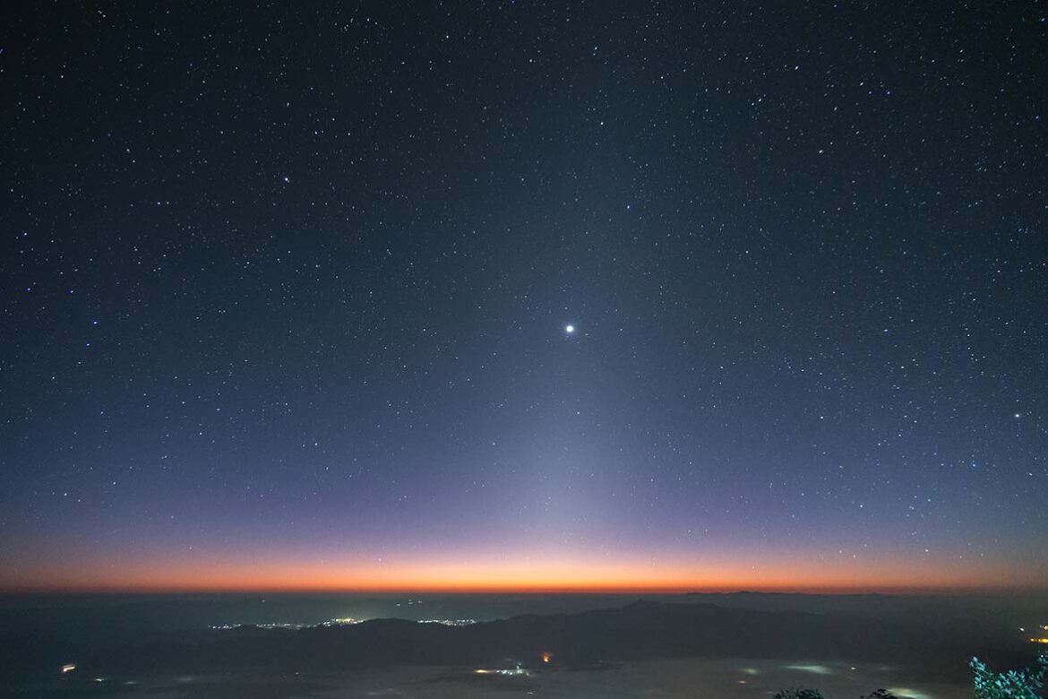 قبل أسبوعين من بداية قمر سبتمبر الجديد قم بالتمعن في الأفق الشرقية لإيجاد وهج مخروط الشكل واسع النطاق يبزع من الأفق متمركزا في المنطقة المحيطة بالشمس على امتداد مسار الشمس وتحديداً في دائرة البروج ( الموضحة باللون الأخضر) . ويكون هذا الضوء ممتدا أسفل الزهرة باتجاه النجم الساطع قلب الأسد في كوكبة الأسد .