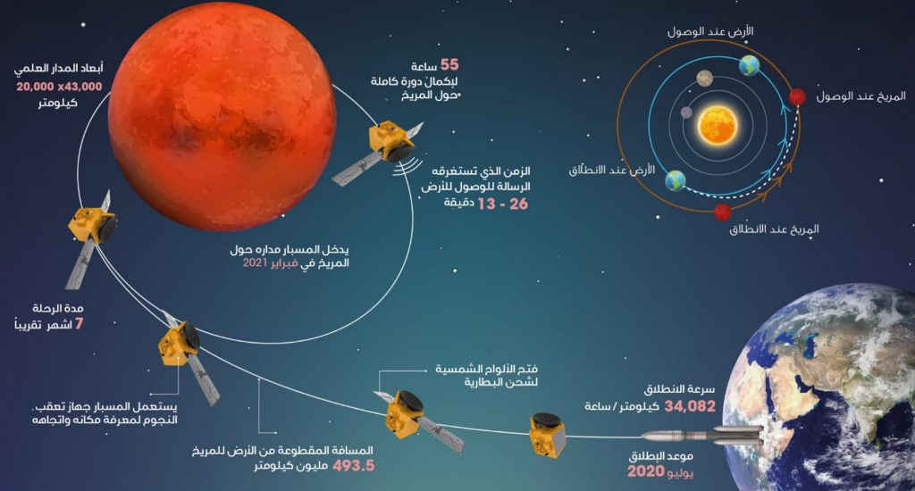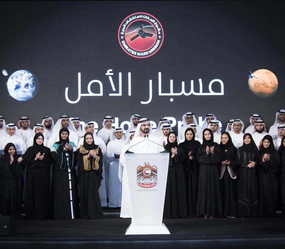تقوم الإمارات العربية المتحدة بالعمل على إرسال مسبار فضائي يُدعى الأمل إلى المريخ ، والذي – إذا تم إطلاقه بنجاح – سيكون أول مهمة عربية إلى الفضاء. ستركز هذه المهمة على دراسة المناخ والغلاف الجوي للكوكب الأحمر ، وعلى الرغم من أن هذا الهدف ليس جديدًأ إلا أن مسبار الأمل سيستخدم أسلوبًا مبتكرًا لدراسة مناخ المريخ على مدار اليوم والفصول ليكون بمثابة أول مرصد جوي للكوكب الأحمر الذي من خلاله سيتمكن العلماء من فهم طبيعة تغير المناخ وتسليط الضوء على أسباب فقدان هذا الكوكب غلافه الجوي.